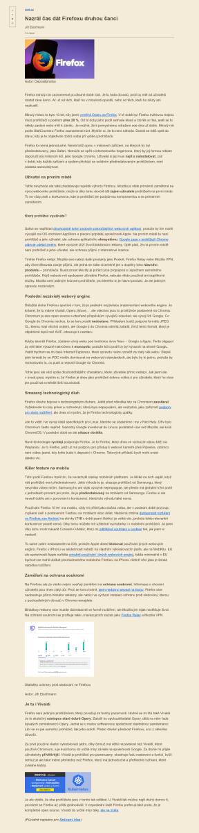 Microsoft Edge: Stiskněte Ctrl+Shift+S, vyberte "Zachytit celou stránku"a snímek uložte. Je ve formátu JPEG, komprese 92 a podvzozkování barev je běžné 4:2:0. Také je možnost kopie do schránky. Text má subpixelový antialiasing (barevné okraje), nehodí se pro prohlížení ve zvětšeném měřítku nebo další grafické zpracování.
