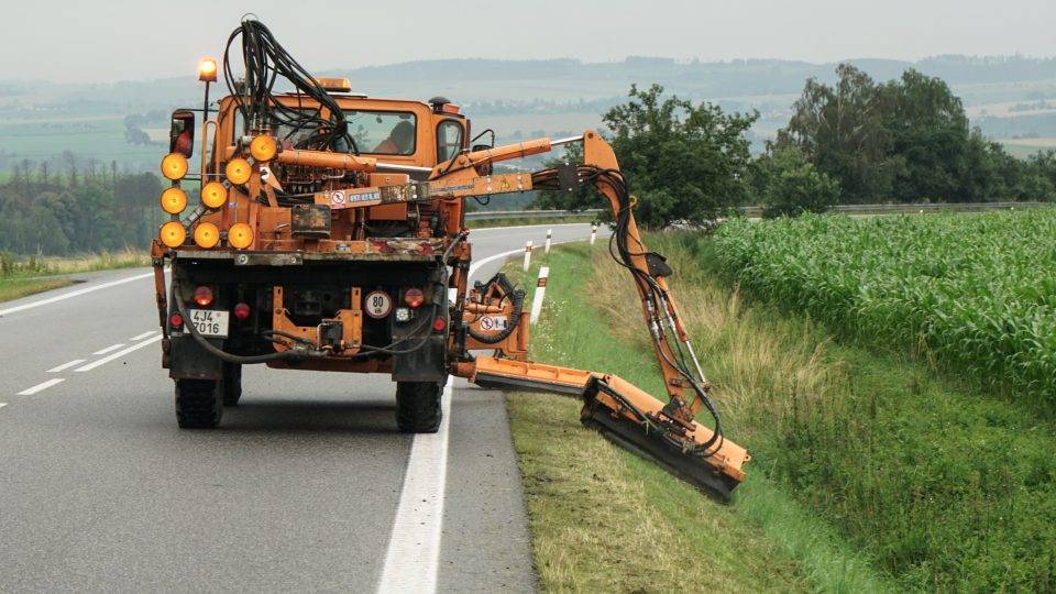 Dojeli jsme traktor silničářů který sekal trávu na mezi ( okraj vozovky ). Byla tam plná čára.