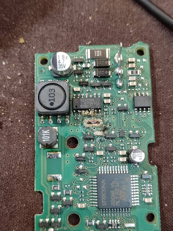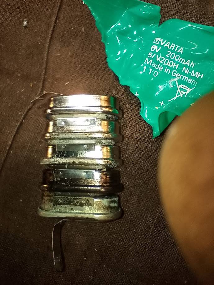 Tak rozpuleno dremlikem. Uvnitř to vypadá úplně jinak ( i někde na webu jsem našel info o dvou úplně odlišných vnitřních provedeních, asi jiná výroba). Baterka je jedna pětičlánková a ač zvenku vypadala jak nová a i pri nabíjení přijala odpovídající kapacitu, jeden z článků uvnitř už sáknul, jen nenápadně, zato až na desku. Takže nejbližší šváb vedle vývodu obrostlý výkvětem, prosáklo to prokovenyma dirkama i na druhou stranu desky. Zatím jsem to vydrbal kartáčkem a čističem a nemám jak sirénu bez auta vyzkoušet, než budu případně kupovat baterku do ní novou, respektive nahrazovat článkama z nabíjecí devítky. Při připojení na stole jen k napájení nedělá nic, ani nedobiji, jen bere cca 0,3mA a náhodně jsem na desce našel kromě napájecího napětí i 5V a někde i nějaký měnící se napětí, tak snad v tom něco žije.