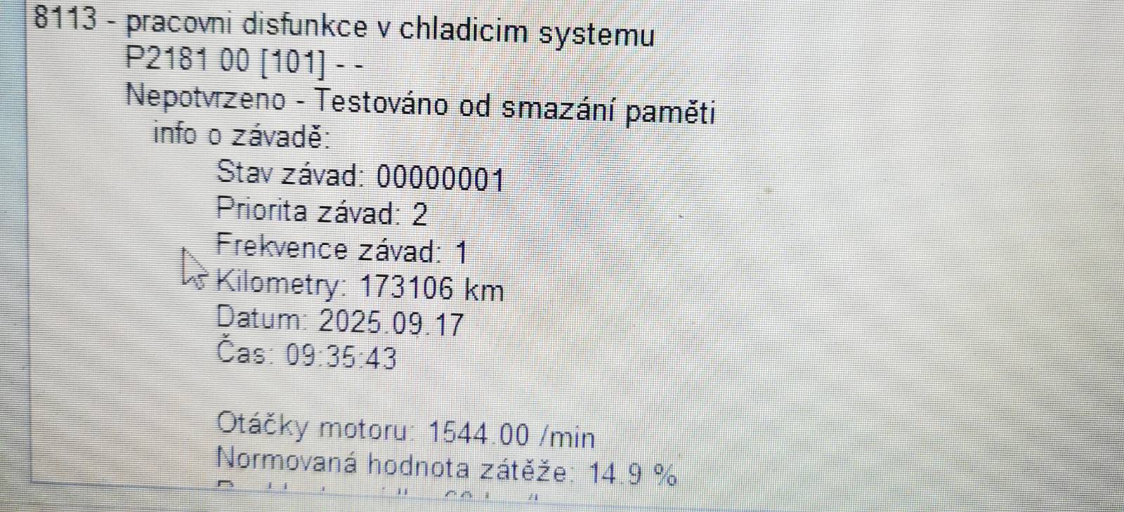 Dobrý den, Minule jsem tu psal chybu uvedenou výše ale ještě jsem zapomněl podotknout. Že když se ten motor přehraje tak tam vletne tato chyba. Ale ta jde smazat ta výše přetrvává a nejde smazat. A delší dobu vždy trvá než se motor nahraje a pak se při jízdě po nějakém km přehraje.