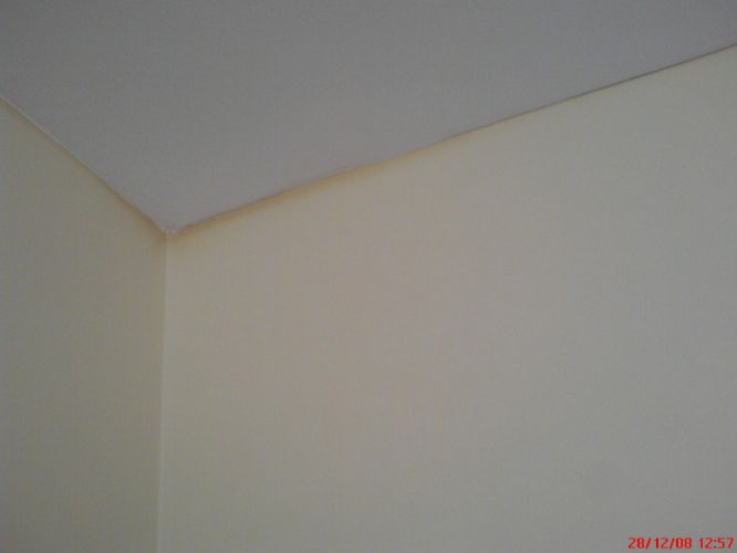 Podle obrázku soudím,že je okolo sádrokartonu škvíra.Tou se může vlhký vzduch dostávat až na chladné místo na věnci a odtud kondenzát mezerou stéká dolů.Doporučil bych okolo spojú nalepit polystyrenové ozdobné lišty(silikonem v tubě.) a akrylovým tmelem zastříknout spoje se zdí i stropem.Zamezí se průnik vlhkého vzduchu nad sádrokarton a celek vzhledově velmi získá.
