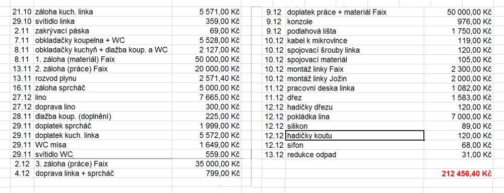 krtek - Tohle není předběžná nabídka, ale rekapitulace celkových nákladů po dokončení práce. Různé práce prováděli různí řemeslníci a dostali zaplaceno vždy jen za svojí práci. Téměř veškerý materiál jsem vybíral a nakupoval osobně, jednotlivé faktury mám do posledního konkrétního kachlíku. Takže přehled jsem měl dokonalý. Denně jsem byl na staveništi přítomen. Tu tabulku jsem sem vložil proto, aby měl tazatel hrubý přehled, co ta sranda stojí.