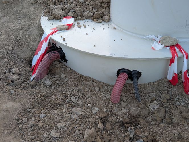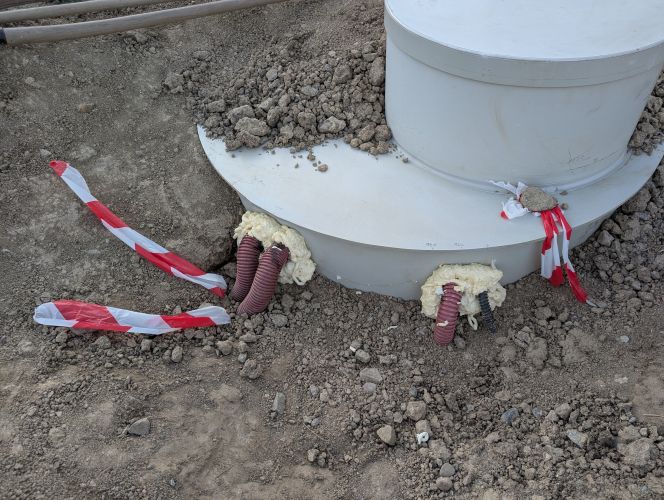 Tak od víkendu hotovo. Udělal jsem co nejmenší otvory, z venku 2x utěsněno bitumenovým střešním tmelem + po 24h zafouknuto montážní pěnou + 1x zatmeleno i zevnitř a opatrne zaházeno jemnou hlínou.