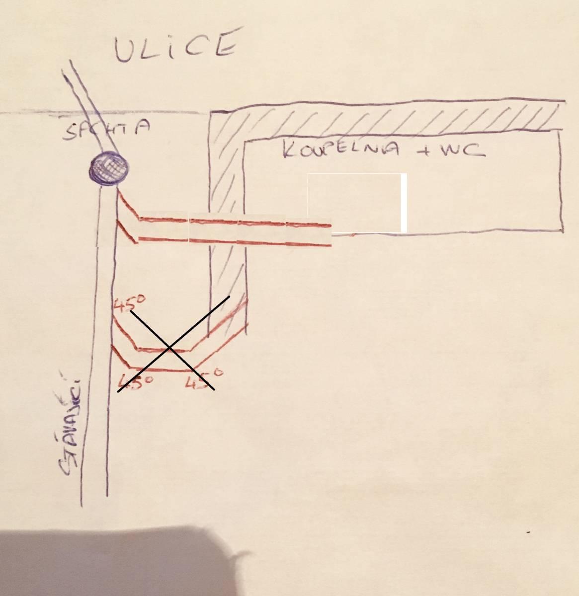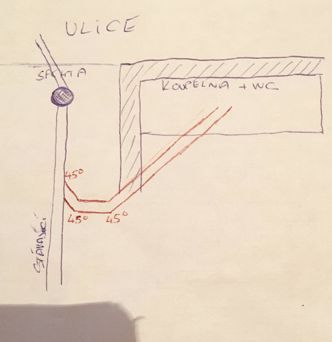 jde o to, že ležaté potrubí v domě je mnohem výše, než šachta. což je logické. ale jelikož jsem od šachty z budoucí koupelny jen 2m přes obvodovou zed, tak bud mi musel být spád 40cm na metr, což je nesmysl. tak abych dodržel spád 3-4procenta (což budu mít doma pod podlahou) a až se budu blížit k obvodové zdi, zatočím dolů(cca 80cm),,,,prorazím zed a do šachty už venku znovu jedu se sklonem 3-4procenta.