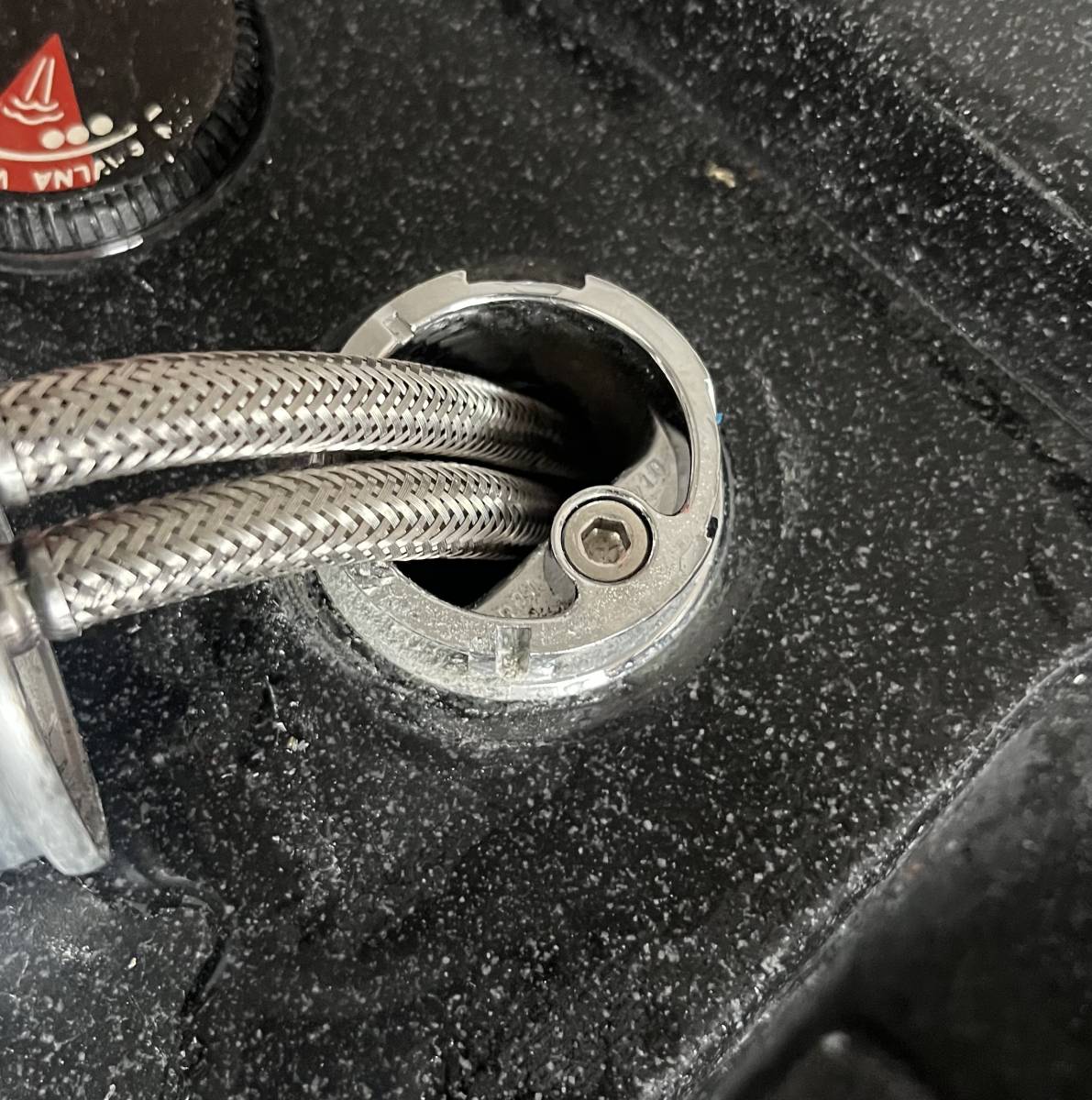 Já to vidím tak, odmontovat hadičky, pak otáčet tím lesklým (matkou) co má uprostřed závit. Vidíte ten šroub?