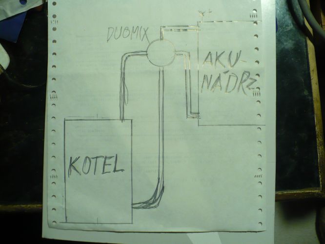 Zdravím.Po zapojení nového radiátoru,následném odvdušnění topného systému mám další problém.Při nabíjení(natápění)akumulační nádrže nemohu topit kotlem(Vulkán 22 kw)ani na poloviční výkon kotle.Tedy začátkem nabíjení ano,ale jak se nádrž natopí tak na 40-50 st.pak musím u kotle hodně snížit výkon.Ještě loni jsem mohl topit při naplno otevřeném duomixu asi do 80 st.Akunádrž má 1800 lt a teploměr je v polovině výšky nádrže.V místě označeném křížkem jsem nádrž odvdušnil,potrubí a duomix je dvoucoulový, nadrž hned vedle kotle,akorád je o metr výš.Kotel jsem zapustil 35 cm do podlahy,nádrž je u stropu sklepa.Vývody z kotle jsou sice vodorovný,ale hned jsou kolena nahoru.Může být potrubí okruhu nabíjení ještě někde zavzdušněno?Myslím,že stačí ovzdušnit v horním rohu akunádrže(viz.nákres),jak jsem to udělal.Má někdo jiný názor?Kdyby to dělalo od zabudování,myslel bych ,že je to špatně navržené,ale už je to takhle 8 let a bez problému.Díky za reakce.