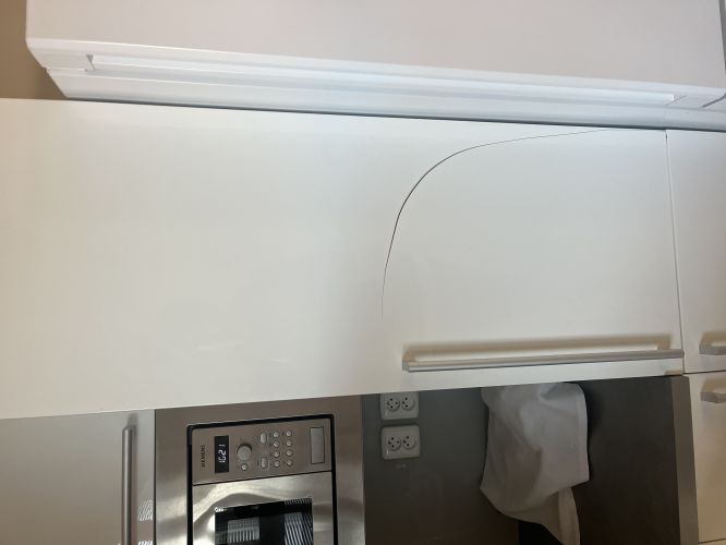 Jako první pomoc bych neretušovala, ale naopak vypíchla. Bude to vidět na první pohled, ale brát to jako ozdobný prvek. Na dvou - tří dvířkách nějaký podobný motiv oblouku.