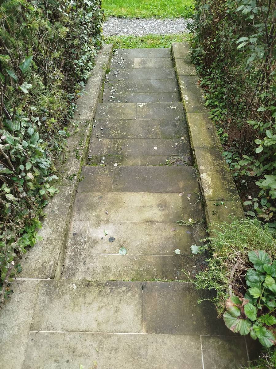 Schody jsou mokré. Odstranit všechny křoviny vpravo a vlevo, aby byl lepší přístup vzduchu. Přidělat železné pevné zábradlí.