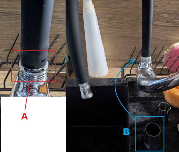 Jestli z místa "A" teče voda, pak je poškozený nebo odřený o-kroužek (černé těsnění). Ten o-kroužek je položka za pár korun a je snadné ho vyměnit. Stačí starý o-kroužek vytáhnout z drážky (bez poškození) - třeba pomocí párátka a pak koupit stejnou velikost.