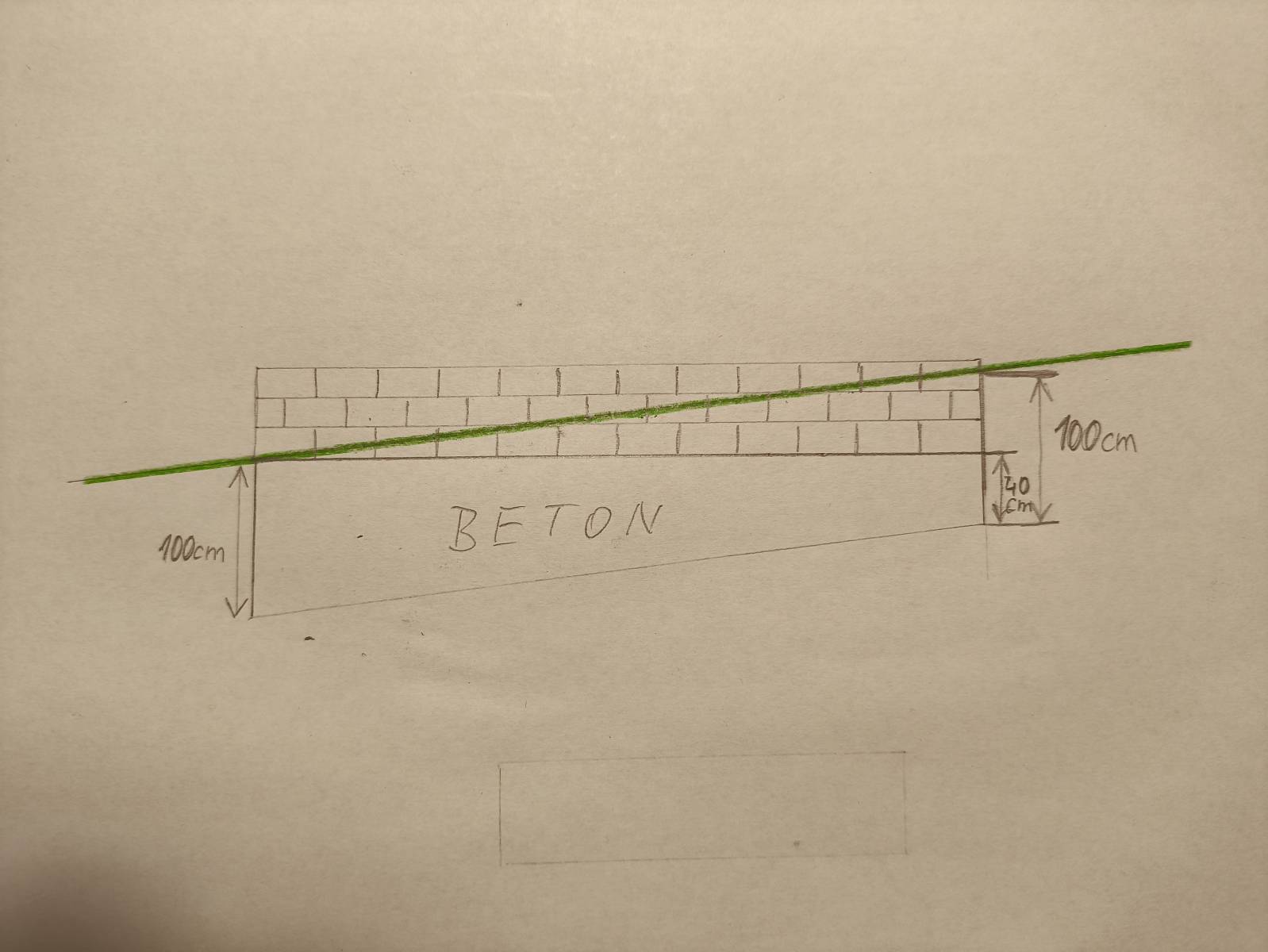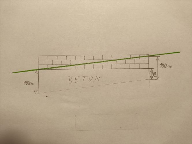 Stavím garážové stání pro dvě auta v mírném svahu (sklon cca 6⁰ mám téměř vykopané základové pasy, na to přijdou po vylití betonem 3 řady ztraceného bednění. Může to být takto jak je znázorněno na fotce anebo prohloubit základy v té pravé části obrázku? Obrázek znázorňuje boční pohled. Díky za rady a připomínky.