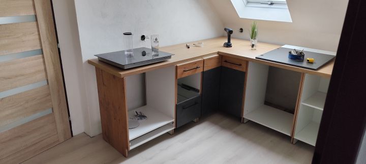 Ted na pohodu i na kraji a taky na občasné vaření, ideální ta rohová skříňka *palec* ještě sem viděla do tohoto typu skříňky otočný regal žádné lezení pultela do skříně...pokud kutite sám tak *palec2* cením kdyz se pokusí si každý aspon neco vyrobit sám.