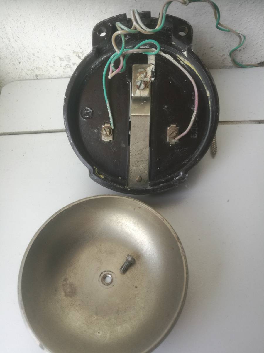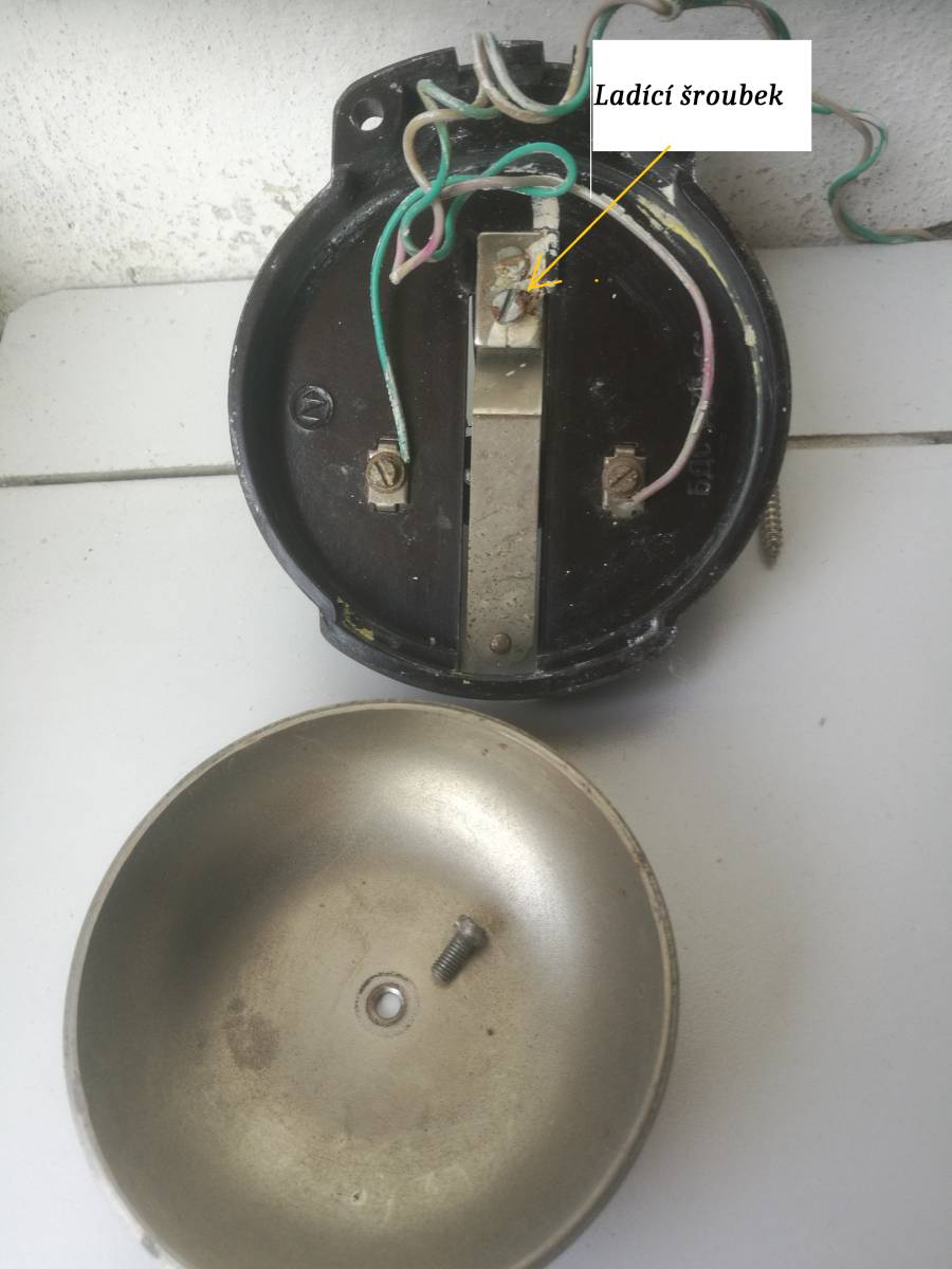 Někdy se o ten kovový díl opíraly i dráty, kabely nebo napadaná malta, štuk nebo při malování na to kápla barva-opět špatný zvuk. První varianta je někoho postavit dolů k tlačítku zvonku, co bude "mačkat" a v bytě někoho na "štaflích", co bude pomalu pootáčet tou zvonivou kovovou částí kolem dokola ve směru hodinových ručiček(kvůli šroubku co to drží, má pravý závit. U některých zvonků je potřeba ten šroubek přeci jen povolit, aby nepraskl ten bakelit co je v něm šroubek, mám tušení, že to bylo u typu zvonku, kde byl šroubek s pérovu podložkou). Ten kovový zvonivý díl u starších verzí nemá rovné ukončení v části "u klepátka", takže to naladění by se mohlo povést bez odšroubování z držáčku v rozvaděči. Pokud to nepůjde doladit pootáčení, tak odšroubovat zvonek a doladit zvuk stavěcím šroubkem nebo nepatrným přihnutím kovového jazýčku s klepátkem a to např. kleštěmi "čápovkami"(úzké delší čelisti) nebo podložením sirky, špejle pod ten jazýček zhruba v polovině a přitlačením na jazýček prstem u "klepátka".