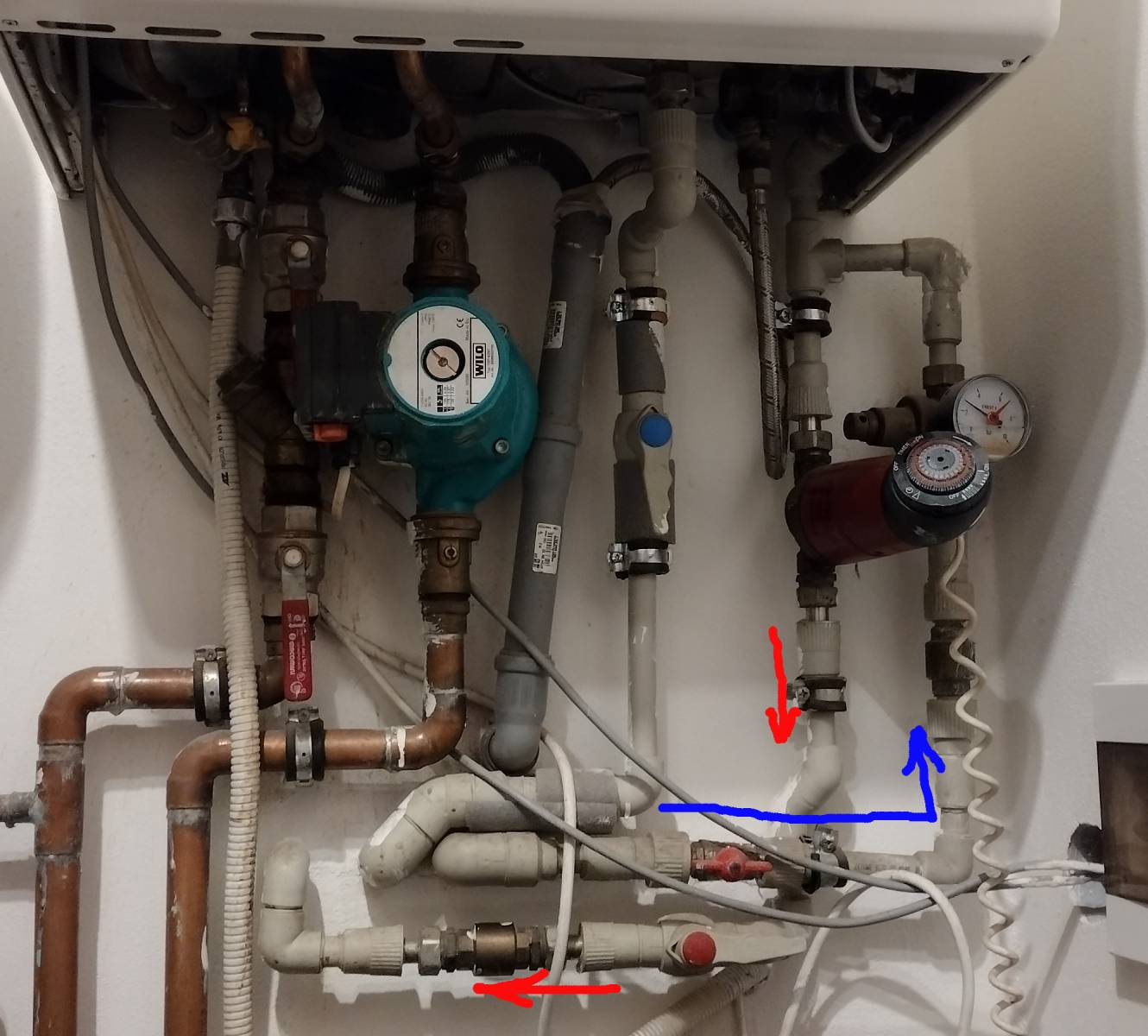 Modrá šipka - směr správný, vstup studené vody do kotle