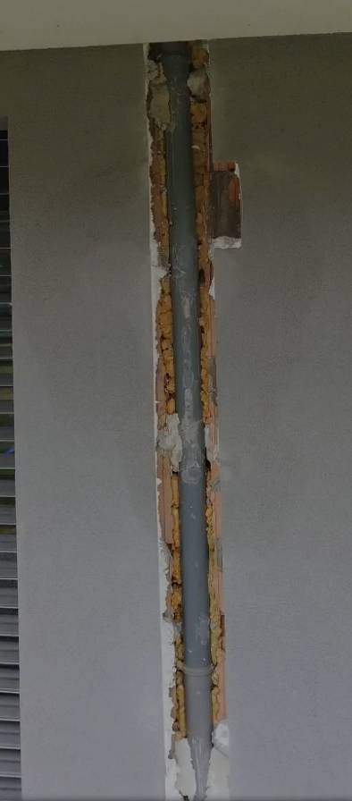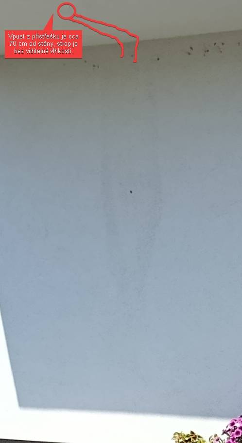 Novostavba, stáří 7 let. Asi 2 roky zpět se na zdech ukázala prostupující vlhkost, na malé ploše i vzdouvání omítky. Vlhkost se ukázala v místech, kde vedou odpadní trubky ze střechy a přístřešku do retenční nádrže. Svody jsou v protilehlých stranách domu, kde je přímé slunce ráno a na druhé zdi pak odpoledne. Patrně (podle firmy) dochází k chlazení odpadní trubky prouděním studeného vzduchu z nádrže nahoru. Těsnění kolem vpustí do trubek je kontrolované a jsou v pořádku. V původním stavu nebyly odpadní trubky nijak izolovány, jen montážní pěna, jak vidíte na fotce. Firma, která nám to opravuje (není to firma co dům stavěla), nám tedy odstranila malý pás izolace a bylo to asi 2 měsíce otevřené (začátek září – konec listopadu). Během této doby se mapy po stranách se střídavě ukazovali a mizeli i když to bylo otevřené. Nicméně, zedník použil nějakou jinou izolační pěnu na trubku po celém obvodu i délce (pouze od spodní úrovně izolace až po strop přístřešku), do mezery vložil polystyren a zalepil. Nyní, po asi 3 týdnech vidíme, že vlhkost prostupuje znovu, prakticky přesně v místech, kde byly mapy vlhkosti již vidět.