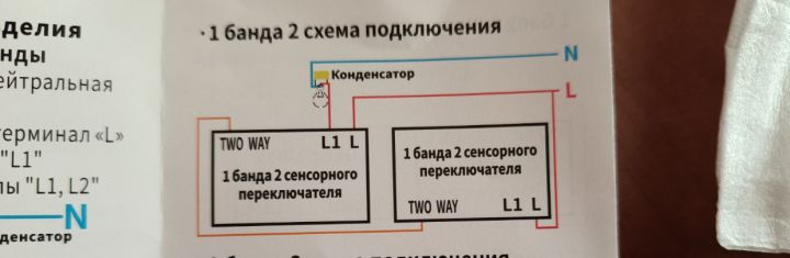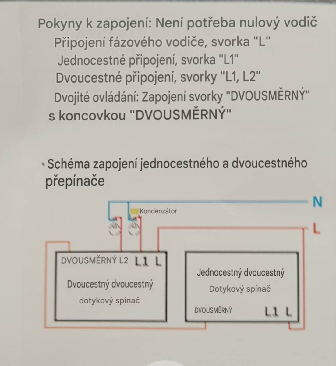 nevím jestli máte už zapojeno jestli ne tak to udělejte podle schematu vždyť ho tam máte tzn.: vemte wagosvorku se třemi vstupy na straně přívodní fáze (stálá) zapojte černý vodič který je pod napětím hnědý který byl dosud jako propojovací a kousek cca 10 cm vodiče nového do té wagosvorky ten druhý konec nového vodiče co teď trčí zwagosvorky zapojte do vypínače na svorku L a šedý vodič do sworky to way jděte k druhému vypínači a tam zapojíte hnědý vodič do L šedý vodič do to way a zbylý vodič je od světla a zapojte jej do L1 a mělo by to fungovat kdyby vám to mrkalo nebo nějak svítilo při vypnutí tak vsadíte na svorce L1 do serie s vodičem od světla onen kondenzátor. pak dejte vědět jestli to svítí