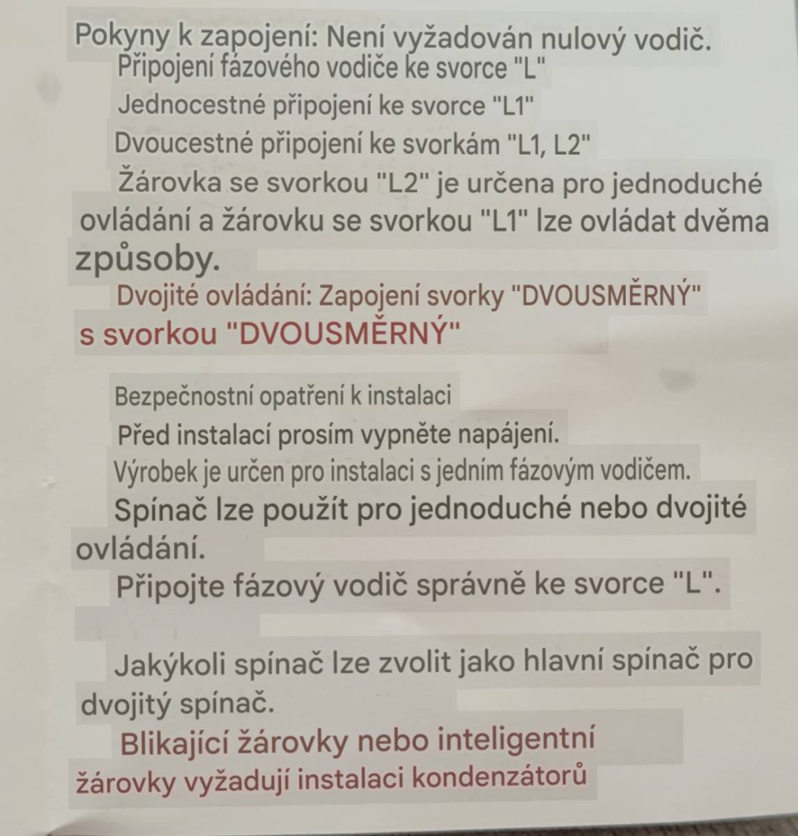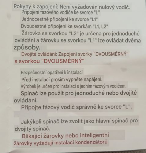 tak je to zmetek výrobek zkuste vypínače ještě zaměnit mezi sebou zapojeno by jste to měl mít správně ještě mě napadá toto zapojení není jako klasika vypínač 6. kdyby to byla šestka tak zapojení znáte na prvním vodiči dáte fázi na na L a dva zbylé na zbylé dva vodiče jedno který na který a na druhém vypínači dáte světlo na L a zbylé dva vodiče na zbylé kontakty a funguje to jenže podle schématu to není klasická 6ka a oba vypínače potřebují ostrou fázi na Ltu jsme tam poslali po hnědém vodiči šedý zůstal jako korenspodák který se zapojuje na twoway a odvod do světla L1 to jste udělal dle zadání ale chová se to jako jednička vypínač k diagnostice problému už to vyžaduje měření ale ne tou vaší fázovkou ale minimálně zkoušečkou sn4 aby jste dohledal co kam teče zkusit před přepnutím vypínače do polohy zapnuto co kam teče oba vypínače když přepnete druhý vypínač tak přeměřit jestli se někde něco změnilo ještě otázka jestli se nedají naprogramovat přes nějakou apku ttypu home asistant za mě osobně mi tam chybí jeden vodič zkuste přeměřit jestli se vám objeví za nějaké situace na kontaktu two way napětí nebo ne, ale opakuji teď to máte podle toho nasdíleného schématu