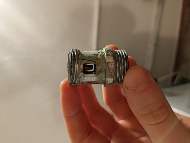 Upřímně, na výměnu to bude zralé celé. 2,77 mm bude asi překlep. 27,7 mm vypadá na metrický závit M28, zkuste změřit stopání pro 5 závitů, tipnul bych M28x1, používá se na perlátorech, ovšem tak velkej perlátor asi mít doma nebudete. Nicméně, pokud vezmete perlátor M22x1 nebo M24x1 a závity zkusmo přiložíte na sebe, pokud zapadnou do sebe, máte stoupání...