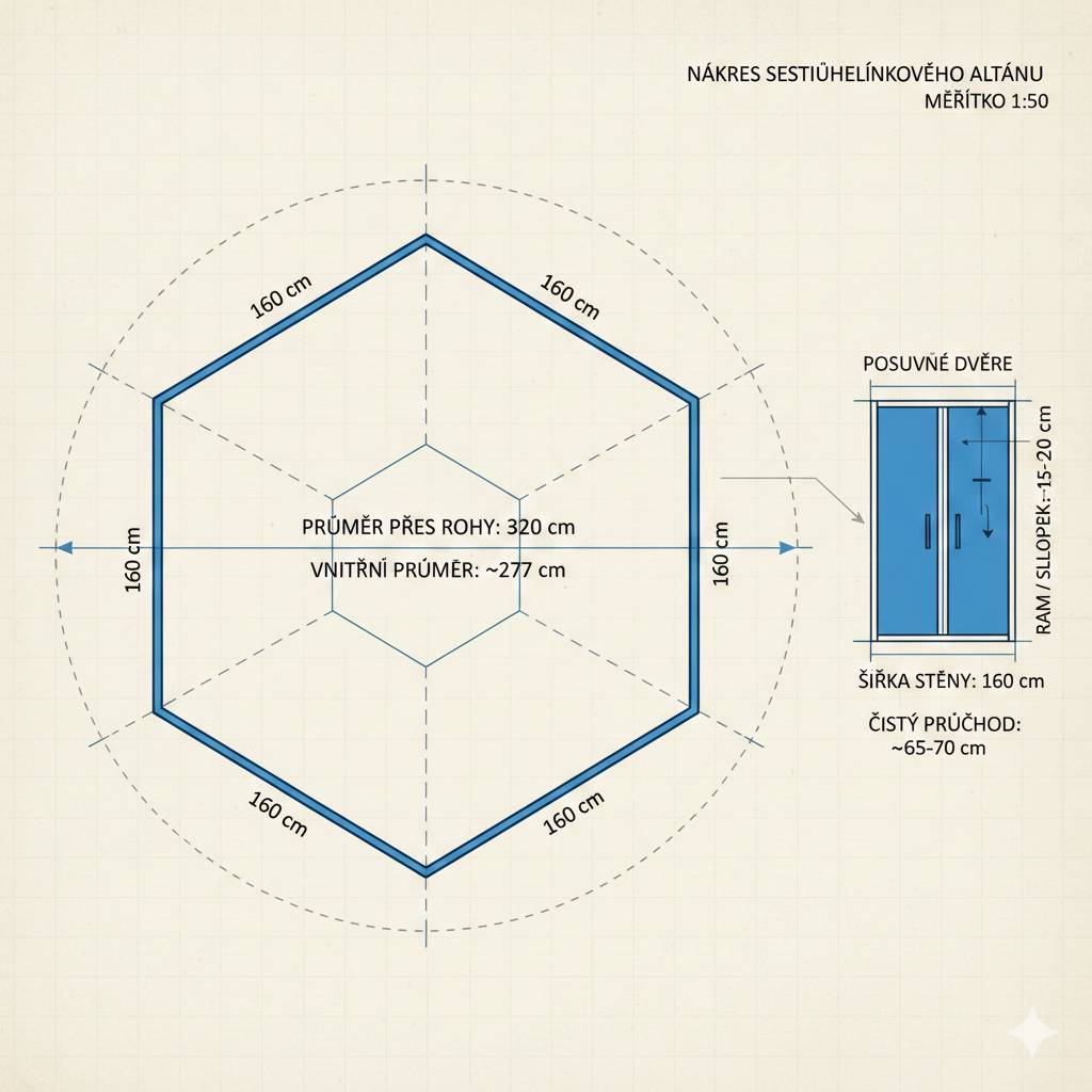 Zdravím kutily a prosím o radu. Nechám si vyrobit altán na míru. Maluji si ho na papír a jsem v koncích. 6stranný prosklený altán o průměru 320 cm. Jedna strana bude tedy 160 cm. Lze do jednoho dílu zabudovat posuvné dveře? Pokud ano, jaký velký by byl průchod? Možná vymýšlím nesmysly. Co vy na to? Ď id