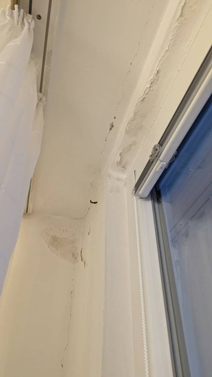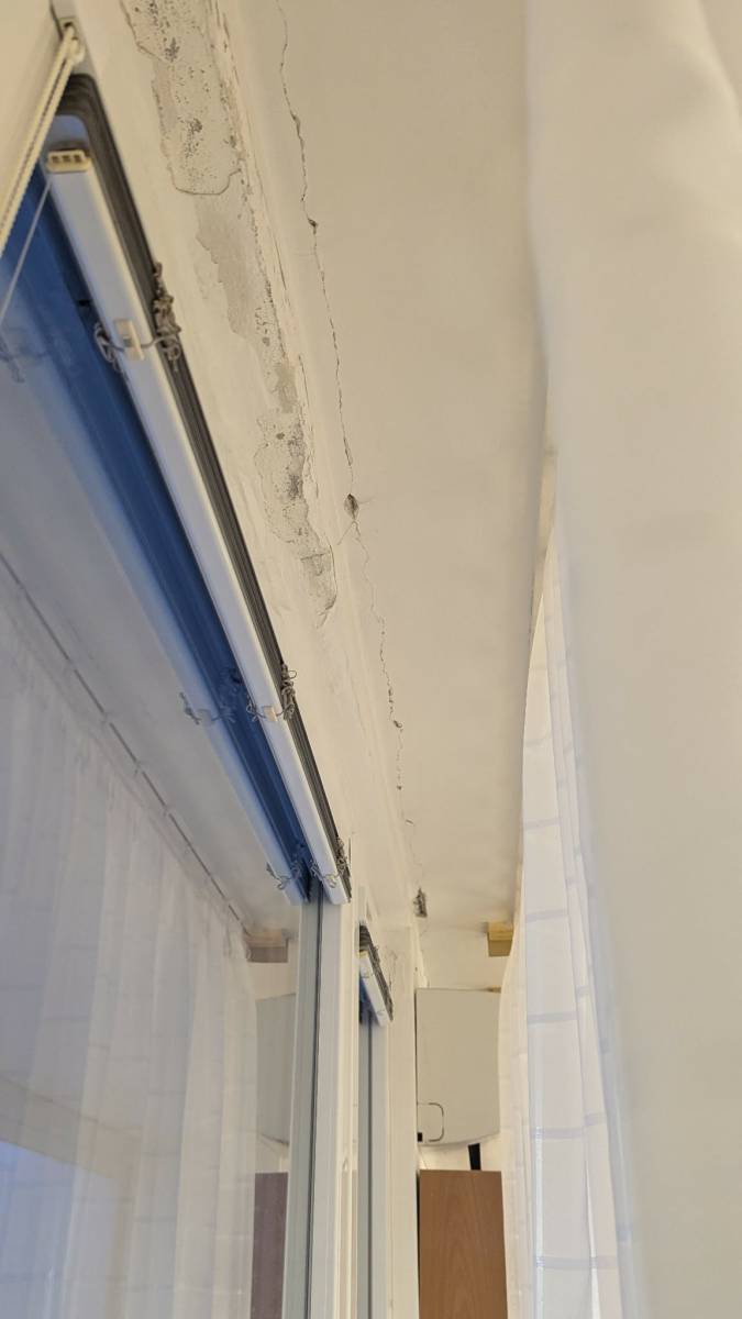 Jedná se o střešní byt zhruba z roku 2000. Při prohlídce jsme si všimli prasklin v interiéru, konkrétně u oken / u zasklené lodžie. Místy je vidět i odlupující se malba.