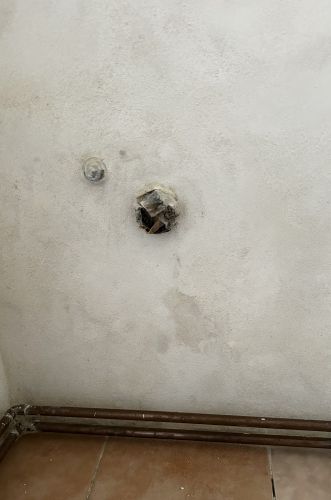 Prikladam foto: Zapraveni odpadu se delalo asi nekdy v listopadu, ta stena kolem toho odpadu postupne vysychala, ale s prichodem zimy, hlavne vlhka, snehu nebo deste, se tam objevil ten flek, a to jeste uvnitr toho fleku byvaji dve mensi sede skvrny. Pokud tento flek vysusim fenem nebo primotopem s ventilatorem, tak zbela, a je videt v omitce minimalne. Flek je napravo od mista, kde se vedla svisle plastova odpadova trubka, vpravo byla asi vetsi dira, kterou lepili maltou. Odpad je nepouzity. Co se s tim da ted delat, pomohla by nejaka vnitrni izolace, tenka deska? Dekuji.