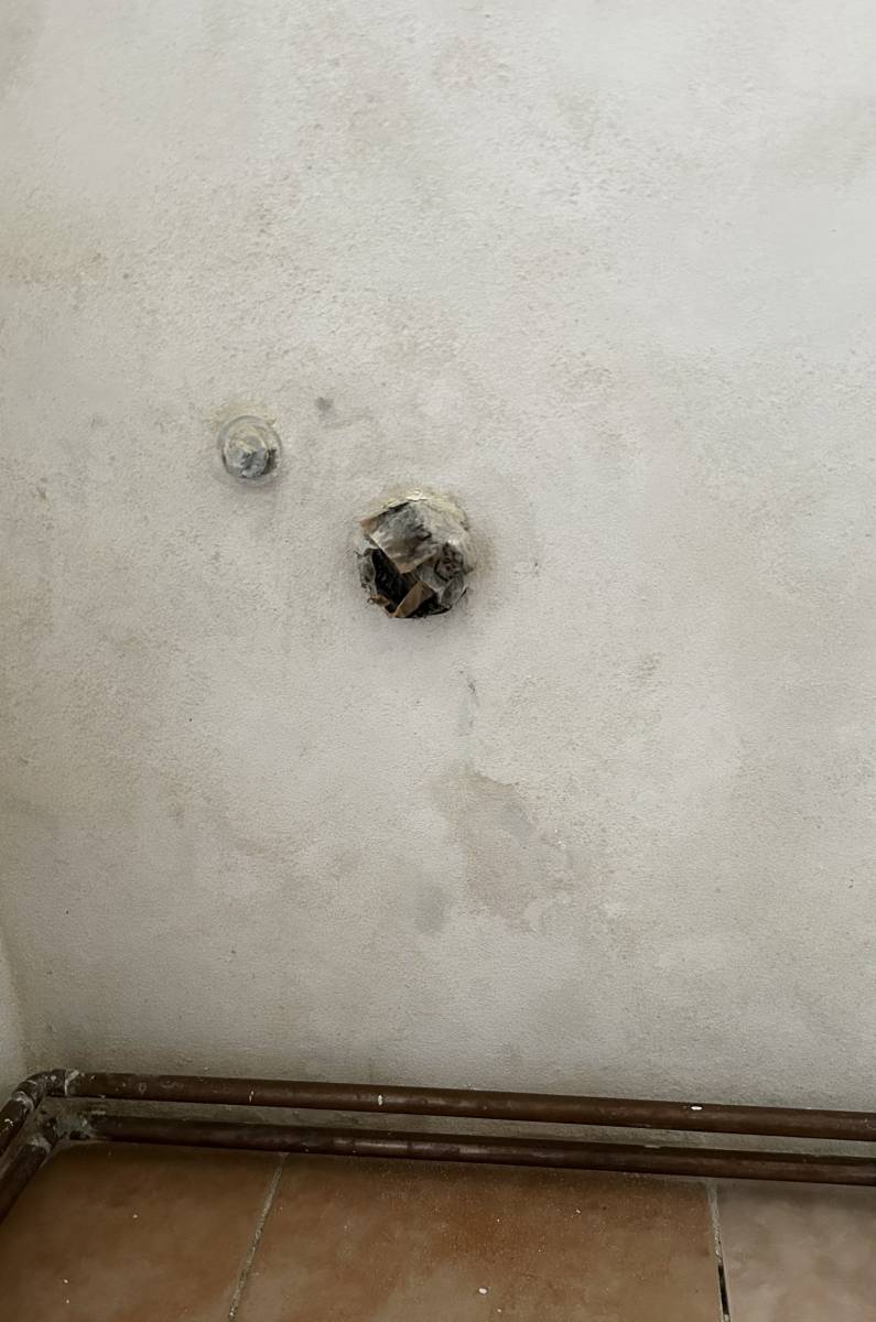 Ten flek je mirne doprava od te sede plastove odpadove trubky, kterou davali, zrejme spatne pak ucpali tu diru kolem maltou? Mela mit ta odpadova trubka nejakou izolaci? Nebo muze byt nejaka vadna? Ten odpad se jeste nepouzival.