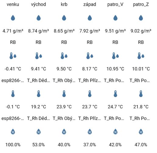 Třeba vám pomůže obrázek. Měříme vlhkost a teplotu venku a v místnostech východ, krb, západ, patro V a patro Z.