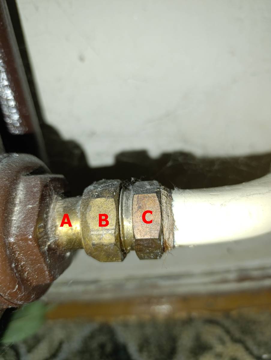 C chyť klíčem, sikovkama a nebo hasákem, záleží co máš, aby se to neotočilo a tím pádem nepovolilo na trubce, pak vem zase druhé nářadí a B se snaž povolit směrem nahoru a přitom tahej obojím nářadím proti sobě, to C drž v jedný pozici a B tahej.