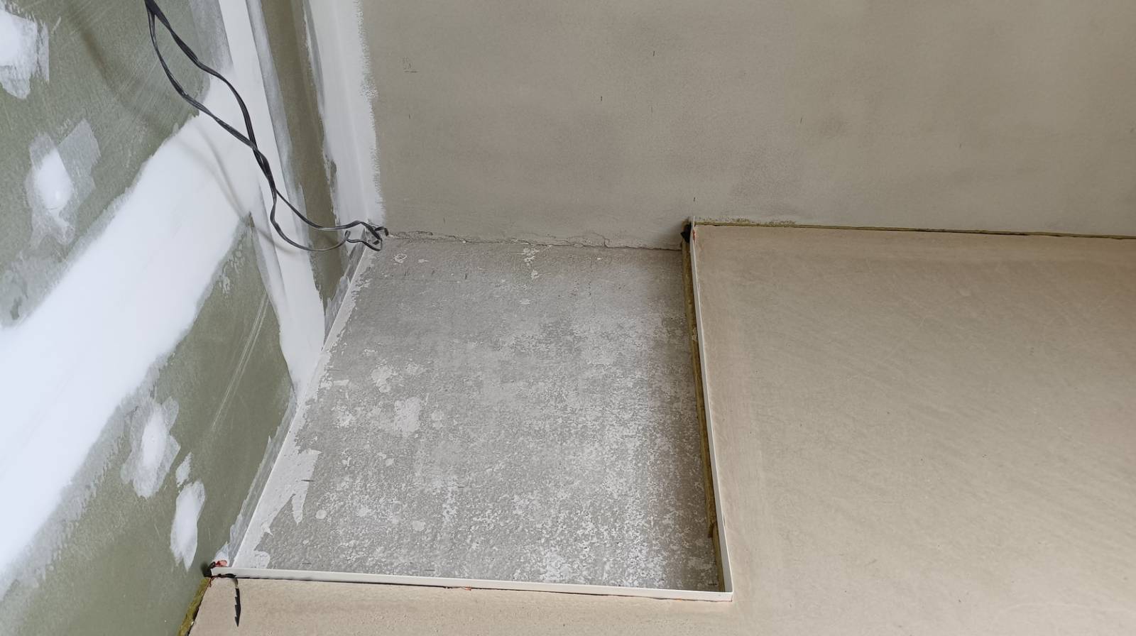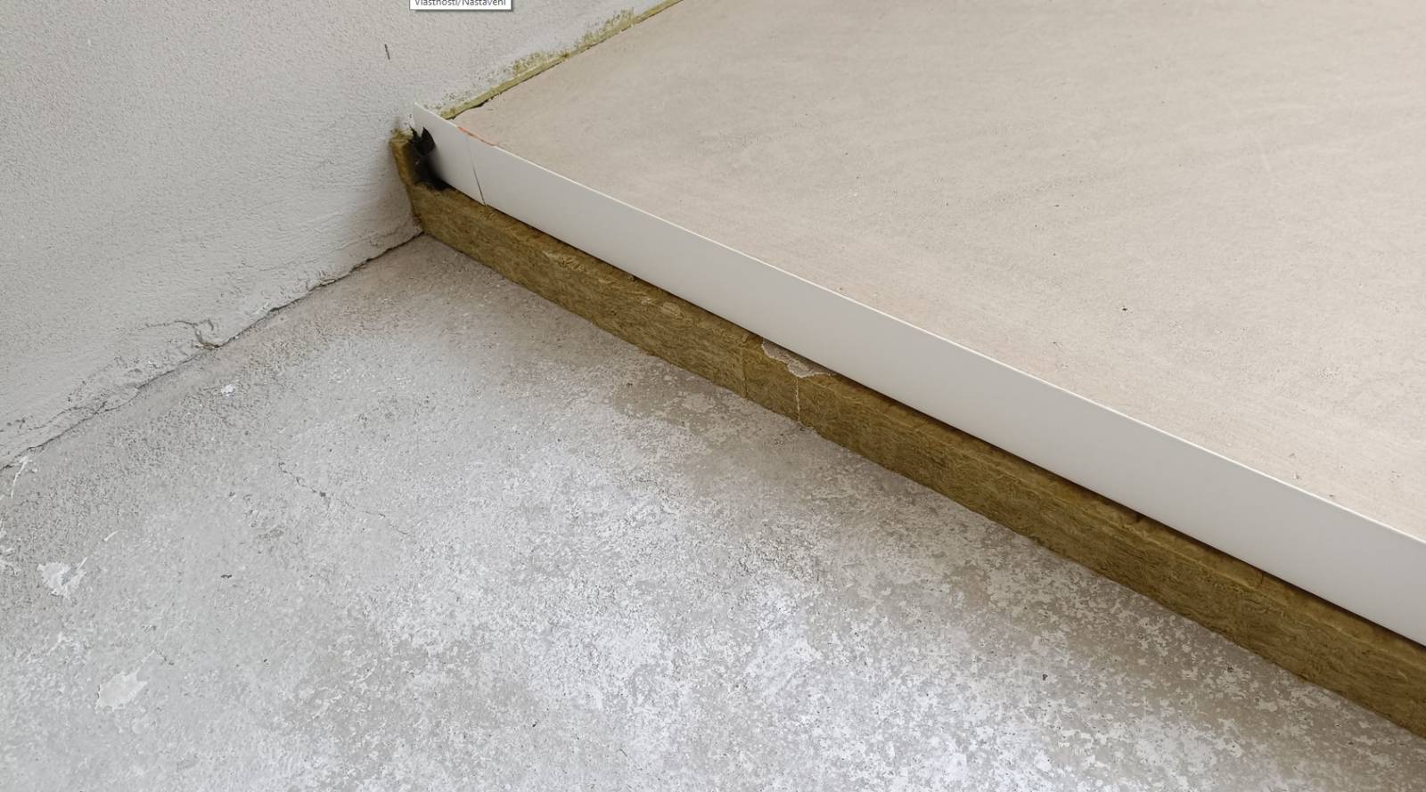 Podlaha: betonová stropní deska, akustická vata a anhydrit. Před stěnou bude ještě 15cm SDK předstěna na odpad a vodu do výšky cca 120cm.