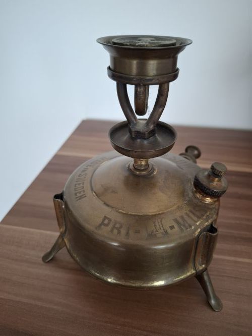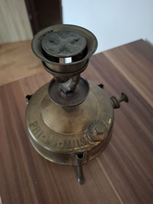 Starý mosazný lihový vařič. Do mističky pod hořákem se nalije trochu lihu, zapáíí a až rozehřeje horní hořák, pak se teprve pustí líh, aby to mělo větší výhřevnost. Spodní díl je nádržka na líh. Chce to ale dodržovat bezpečnost při používání.