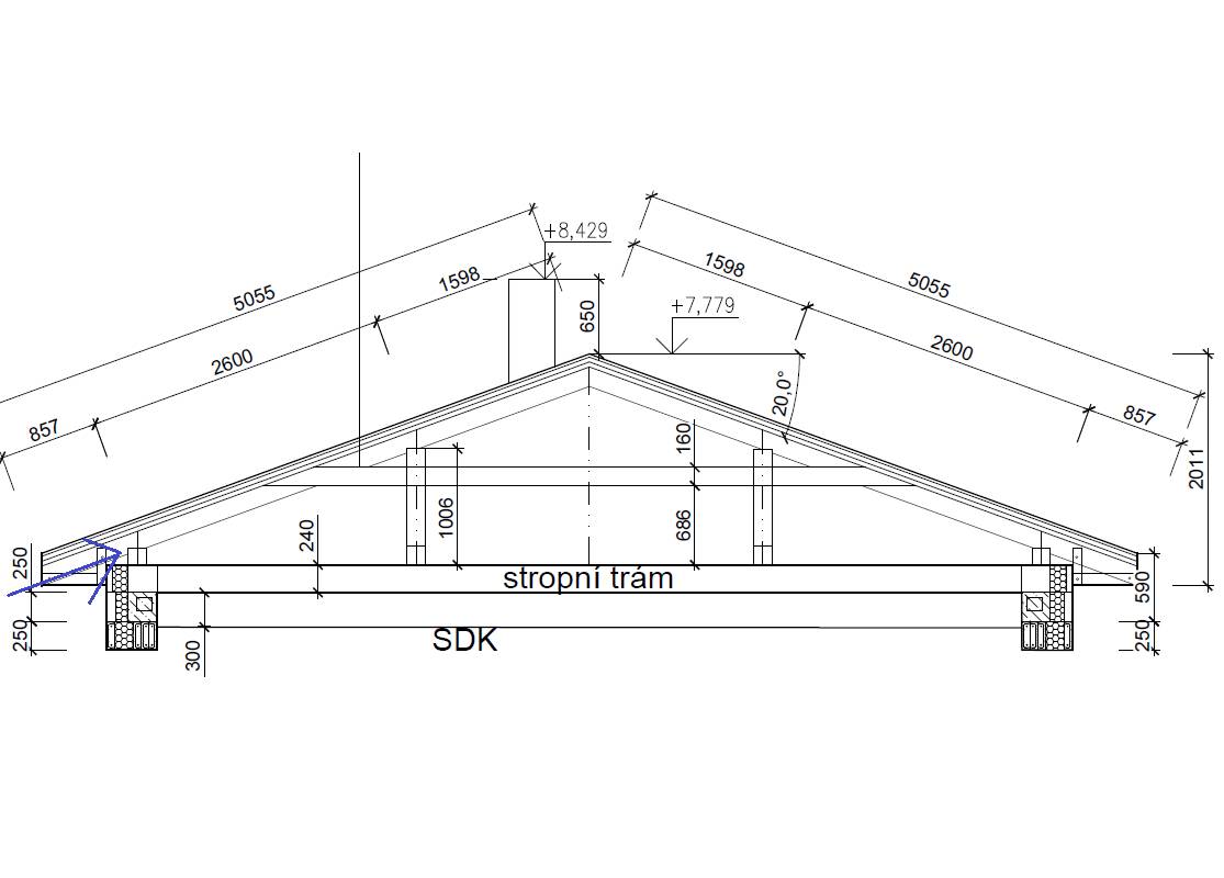 Mám rodinný dům s valbovou střechou viz přiložený řez. Při větru se ze sadrokartonového stropu sem tam ozve zvuk někdy kovový, někdy takové bouchnutí. Něco podobného se stává i když zavírám nebo otevírám dveře. Myslím si, že když fouká vítr, tak vítr pronikne skrz mezírky v podbitít přesahů střechy a kolem pozdenice mezi izolací a střešní fólií. Nevím, zda je to normální, ale prý tam ty mezírky v podbití a kolem pozednice být mají kvůli odvětrávání, navíc dorazit izolaci kolem pozednice také moc nejde aby nebyla napnutá a přilepit k tomu něčím je asi taky blbost. Není problém spíš v SDK stropu (diletace, špatně nastavené závěsy,..), který by si s nějakým zafoukáním skrz škvíry měl poradit? SDK strop v ploše nikde nepraská, jen v krajích praská spíš malba. Jen dodám, že mezi trámy a pod je vata, Nad stropními trámy není žádný zaklop a nak krokvemi jen folie a latě.