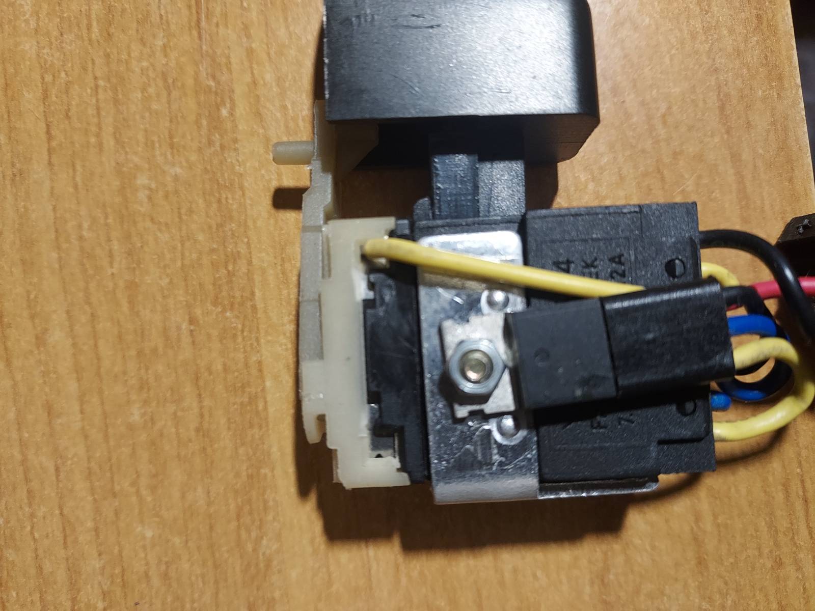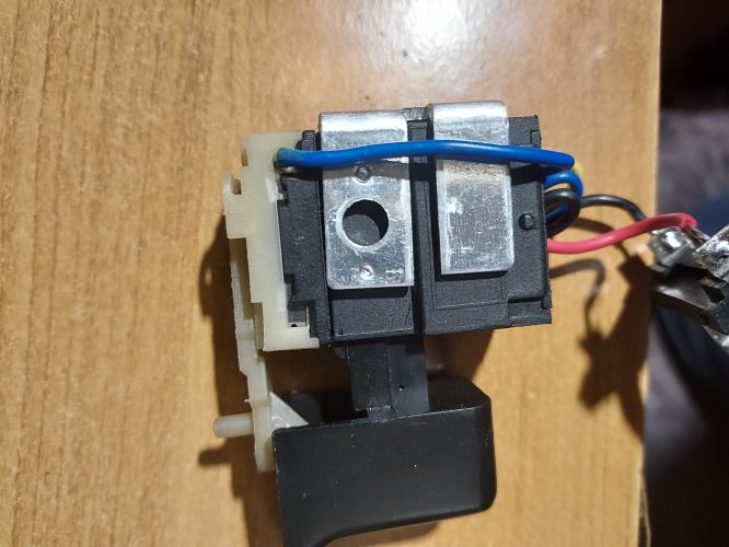 poprosím o radu,jakým způsobem mám připojit motorek vrtačky na vypínač,foto přiloženo.Žádný viditelný šroubek tam není,demontovat páčku přepínání směru otáčení se mi moc nechce,mohlo by se to rozlítnout.Je to myšleno spojit pájením,ty plošky nejsou moc přístupně.Děkuji.