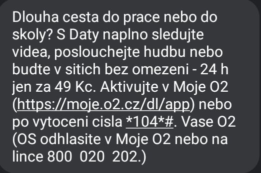 Zdravím,nedávno sem si asi nechtěně aktivoval volání na den za 49Kč při namačkání a odeslání nebo zavolání?m teď už nevím, kódu *104*# na O2 linku. Chtěl jsem tam volat, ale v 17 05 to tam už nikdo nebere a druhý den jsem to neřešil. Existuje nějaká možnost jak zjistit zbývající kredit přímo z telefonu, ne přes nějaké přiblblé.. aplikace, bez toho, aniž bych aktivoval volání na den? Vždy jsem totiž dával *104*# a teď to asi blbne. Nechci to riskovat znova.., jelikož mám aktivován na simce už roky tarif O2 na den a tam je to možno zapnout za 25Kč na den místo 49Kč (pravda, v tom za 49Kč jsou i data neomezená, ale to zrovna nepotřebuji)..Tady přidávám screen co mi před nějakou dobou přišlo po letech z ničeho nic...