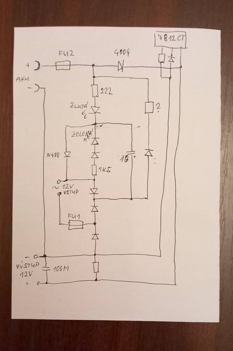 Jinak to vypadá na jednoduchou věc, dovnitř má jít 15V~ a ven 12=. Tak jestli ten stabilizátor je na těch 12 pro výstup, nebo pro nabíjení (a ven jde 12 (teda cca 9-14) přímo z baterky).