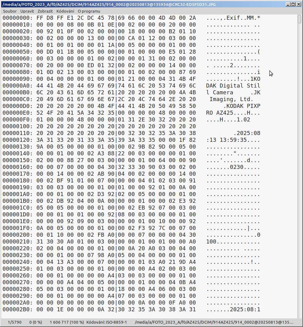To vypadá na vadné soubory. Jak vypadá hexavýpis? Třeba v nějakém souborovém manažeru po stisknutí F3. Přikládám snímek, jak by to asi mělo vypadat (na začátku je exif a tam jsou normálně čitelné textové řetězce třeba typ foťáku/mobilu a 2-3x datum a čas (na začátku záznamu exif značka indiánů MM nebo II, to je taky docela nápadný znak)), pokud takto soubor nevypadá, je totálně vadný (nebo mobil exify nezaznamenává, což ale dělaly jen hodně staré mobily alá nokia108). Pokud vidíte aspoň tohle, tak možná je vadný někde o kus dál.