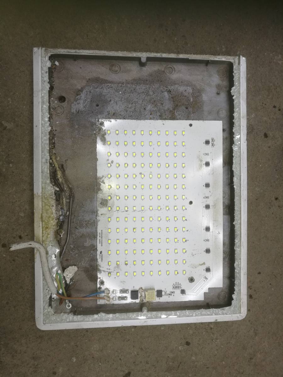 Tady u toho 100Watt reflektoru se pravděpodobně načala jedna LEDka nebo IO na řízení proudu(problikávala 1/6 plochy LEDdiod). Pokoušel jsem se odříznutím boku a odlamovákem dostat pod sklo. Nahřívání horkovzdušnou pistolí změkčilo silikonové lepidlo skla