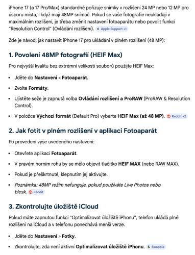 ..problém je při focení s vynuceně zapnutým bleskem na základní objektiv (1x) ve formátu HEIF a rozlišením 48 Mpx. Po stisknutí spouště (SW tlačítko na displeji nebo HW tlačítko na boku telefonu / tlačítko hlasitosti) se rozsvítí led blesk a zůstane svítit a aplikace fotoaparátu po chvíli “problikne” a vydá zvuk (efekt vyfocení fotky), ale reálně se fotka neuloží. Pokud změním rozlišení ze 48 Mpx na 24 Mpx, tak vše funguje v pořádku. Pokud zachovám rozlišení 48 Mpx, ale změním přiblížení na 0,5x, 2x, 4x, 8x tedy všechny kromě 1x tak taky vše funguje, ale všiml jsem si, že se velikost fotografie automaticky změní na 12 Mpx i v režimu 48 Mpx. Problém přetrvává i při pouhé změně formátu z HEIF na RAW. S alternativními aplikacemi problém nebyl jen s nativní aplikací a na starších iPhonech jsem problém nezaznamenal. Mám nejnovější verzi iOS. Je chyba v nativní aplikaci?
