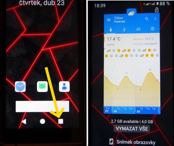 Tak to nikoliv. Kolečko uprostřed mi vrací na displej základní plochu. Trojúhelníček vrací na předchozí plochu. Ten čtvereček otevře galerii snímků obrazovek (ploch) v minulosti navštívených. Snímky se ukládají automaticky a bez mého přičinění. Na to čtvereček mačkat nemusím. Žádná aplikace na pozadí neběží. Jediné, co se s nimi dá dělat, je smazat.