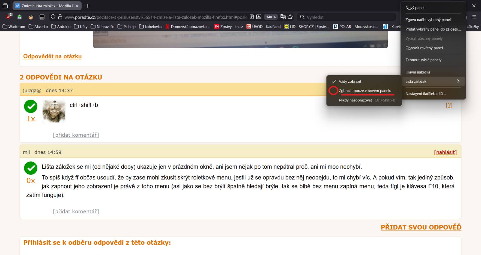 Z ničeho nic mi na prohlížeči Mozilla Firefox zmizela lišta záložek. Nevím jak to nastavit zpět.