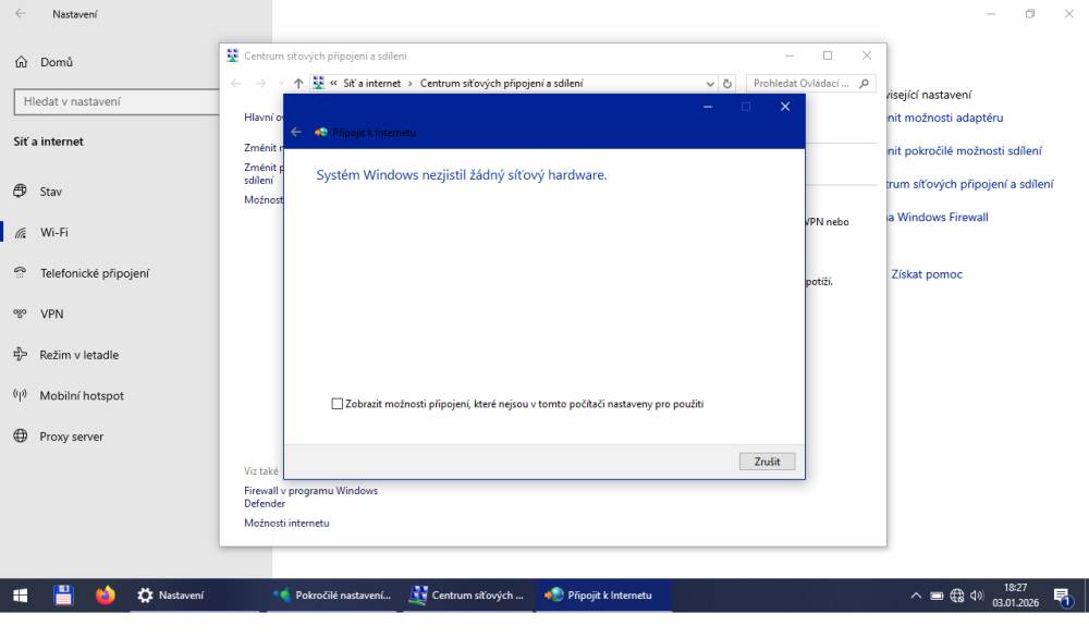 Spojení "kleklo" během session WIN 11 za mým VPN (Proton verze free). Všechny testy Microsoftu byly udělaný, dokonce i kompletní reset sítě, bez úspěchu. Ostatní zařízení se připojovaly k WIFI bez problému, můj pc má dual boot WIN 11 a WIN 10, tak jsem testoval moje spojení pod WIN 10 a to taky fungovalo, čímž jsem definitivně vyloučil problém s hardwarem.