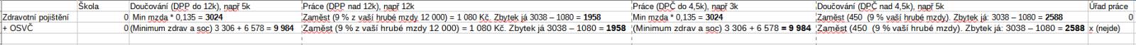 Ahoj, vytvořil jsem si takový přehled, který zahrnuje 2 varinty - odvod zdravotního pojištění (bez OSVČ) a celkový odvod jako OSVČ (řádky) pro kategorie Student DPP a DPČ, ve variantách kdy je i není překročena rozhodná částka + bytí na úřadu práce (sloupce). Celé to je vy smyslu osoby bez zdanitelných příjmů. Chci se především zeptat jestli je to správně, nebo byste něco změnili, díky.