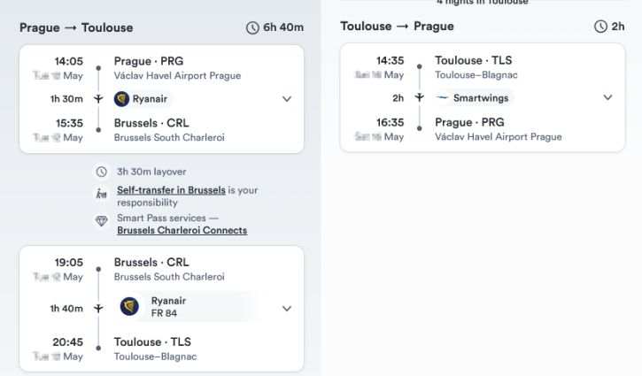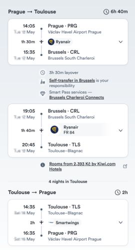 Potřebuji za 2-3 měsíce letět do Toulouse (France), a hledal na kiwi.com spoje. Nabízí se spoj Ryanair z Prahy do Brusselu a pak další Ryanair z Brusselu do Toulouse. Čas na přestup je 3,5 hodiny. Kiwi uvádí že "Self-transfer in Bussels is your responsibility", takže kdyby měl první let zpoždění a já nestih přípoj, tak mám smůlu.