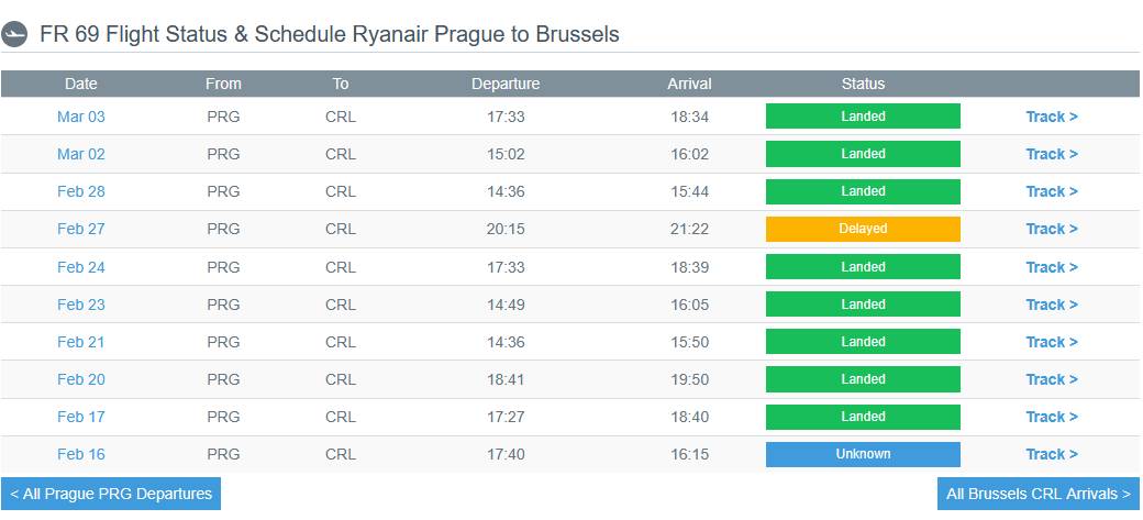 Z toho důvodu jsem si vyhledal statistiku letu z Prahy do Brusselu FR69, a zajímavé je, že není pravidelný odlet není každý den ve stejný čas, ale v různé časy. Viz příloha.