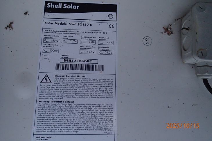 Má to připojovací krabici, kde by se dalo naměřit (pokud to bude vůle Alláha, velkého a slitovného) naprázdno (bez zatížení) DC napětí 43,4 V při plném oslunění. Proud nakrátko je 4,8 A.
