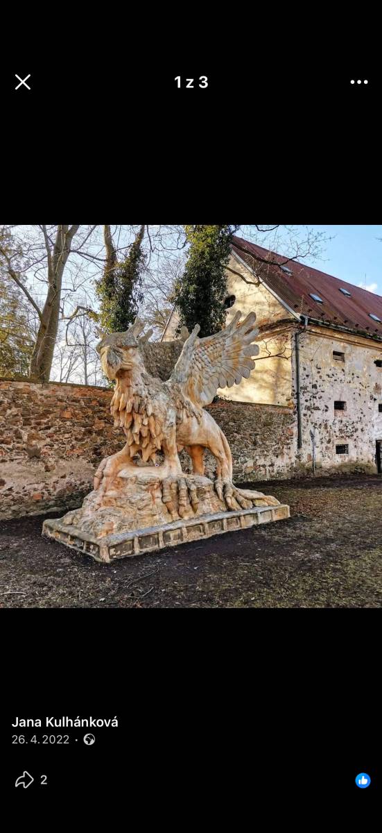 Od Lens: "Tato socha se jmenuje Zámecký Gryf a nachází se v parku zámku Pohled. Autorem třímetrového díla je sochař Michal Olšiak. Zobrazuje bájného gryfa. Socha stojí u vchodu k prelatuře zámku." Bez záruky.